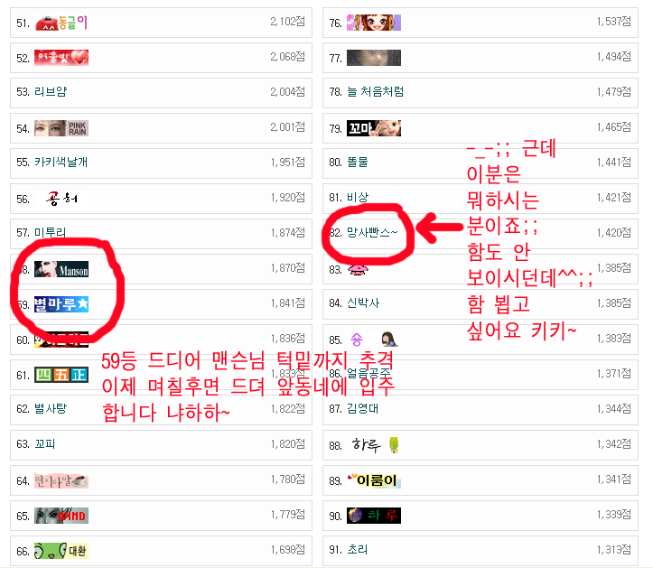 순위에 대해.. 그닥.... 신경쓰는 편이 아니라서.... 마루뉨 덕분에 제 순위도 알아뜸다~~emoticon_005 꽤 마니 올라갔구나.... 저번에 70위인가?? 그때까지 올라간건 봤었는데....emoticon_011