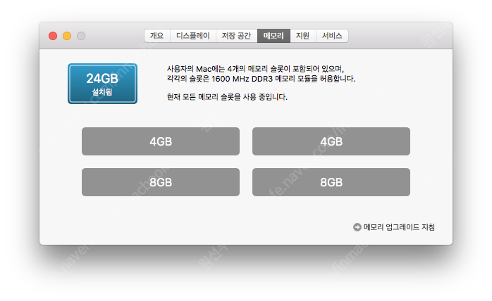 - 올해 초 메모리 추가로 업그레이드 해서 총 24G 입니다.