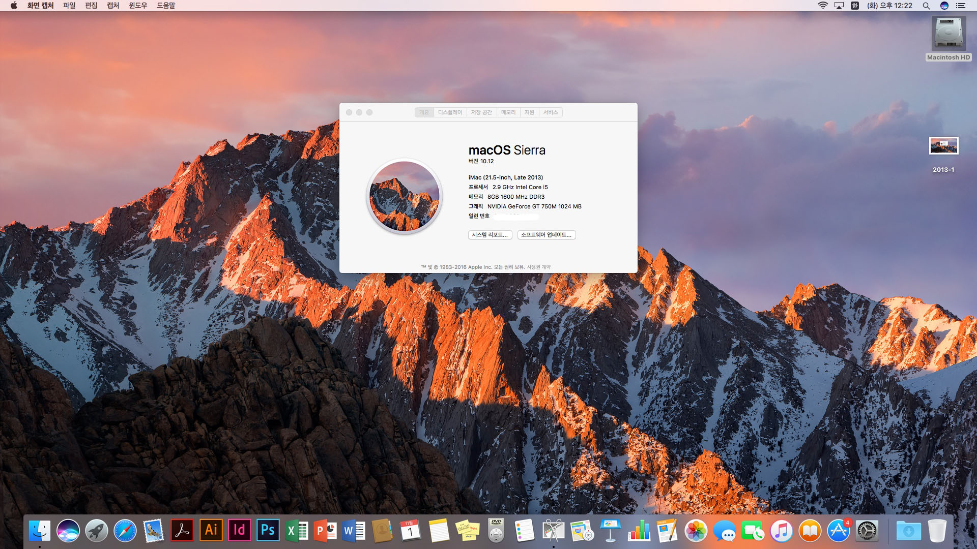 고급사양 2013아이맥 21.5인치 - 시에라와 윈도우즈10 설치됨 -프로그램 완벽설치