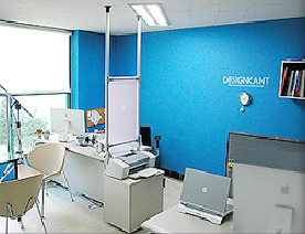 실내에는 코발트블루 색상으로 칠해져있어서 일반사무실 보다 창조적인 디자인 사무실