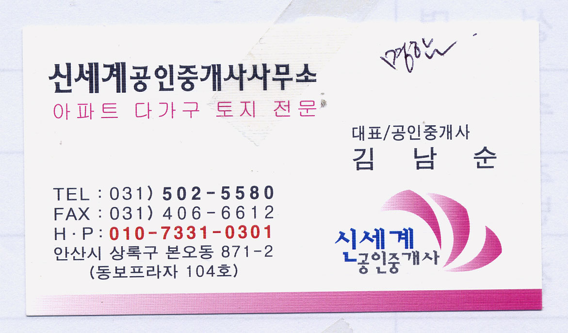 급히 글씨 부탁드립니다~ 조희진 일반 0 3781 2009.05.16 11:43 오늘 들어가야 하는 건데 글씨체가 없어서요~ 똑같이 해달라고 하셨는데~ 상호명하고 하단 상호명 부탁드립니다. 신세계공인중개사사무소 신세계공인중개사
